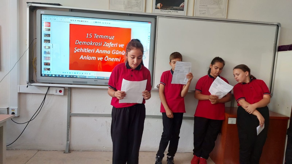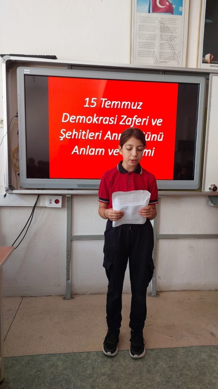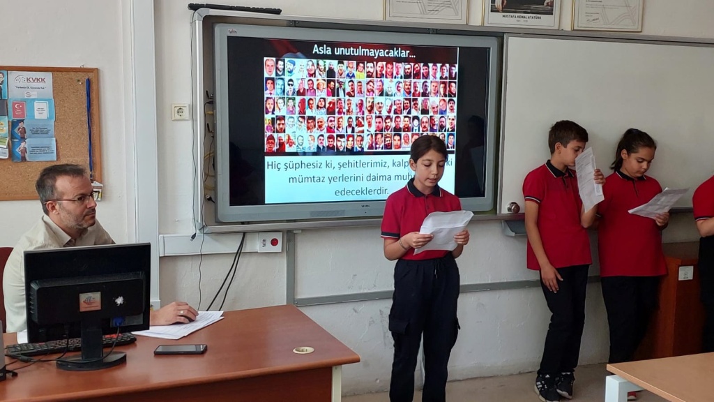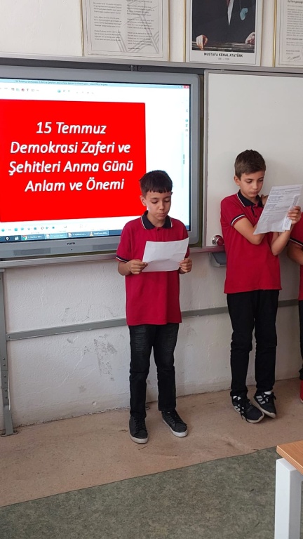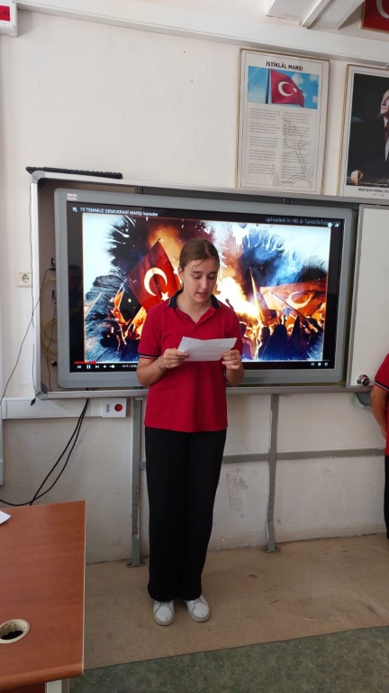 15 Temmuz Demokrasi ve Milli Birlik Günü'nün 9. yıl dönümü kapsamında okulumuzda program düzenlendi. Programda 15 Temmuz şehitlerimiz ve kahraman gazilerimiz anılarak demokrasi ve milletin iradesine sahip çıkma vurgusu yapıldı. Programın ardından sınıflarımızda 15 Temmuz ile ilgili videolar öğrencilerimize izletildi.